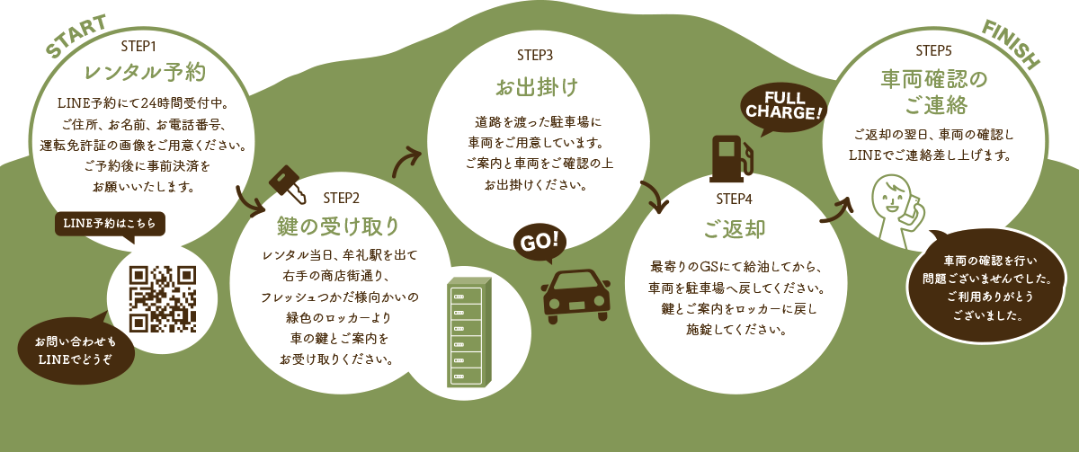 LINE予約にて24時間予約受付中!ご住所、お名前、お電話番号、運転免許書をご用意ください。ご予約時に事前決済をお願いいたします。